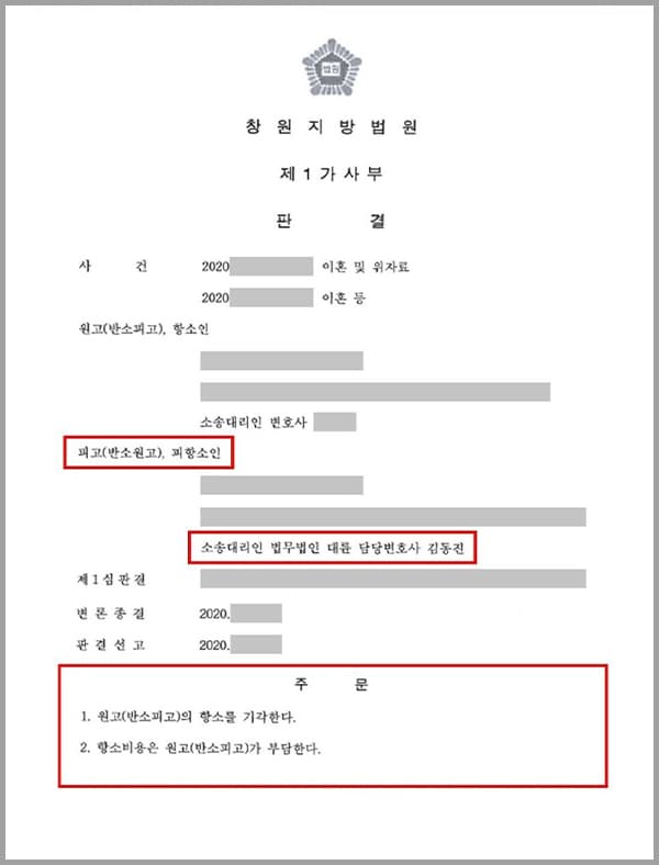 재판부는 본 법인의 주장을 받아들여 1. 원고(반소피고)의 항소를 기각한다. 2. 항소비용은 원고(반소피고)가 부담한다는 판결을 하였고, 의뢰인께서는 항소심 종결 후 이혼소송이 잘 마무리되어 고맙다는 인사를 전해오셨습니다.