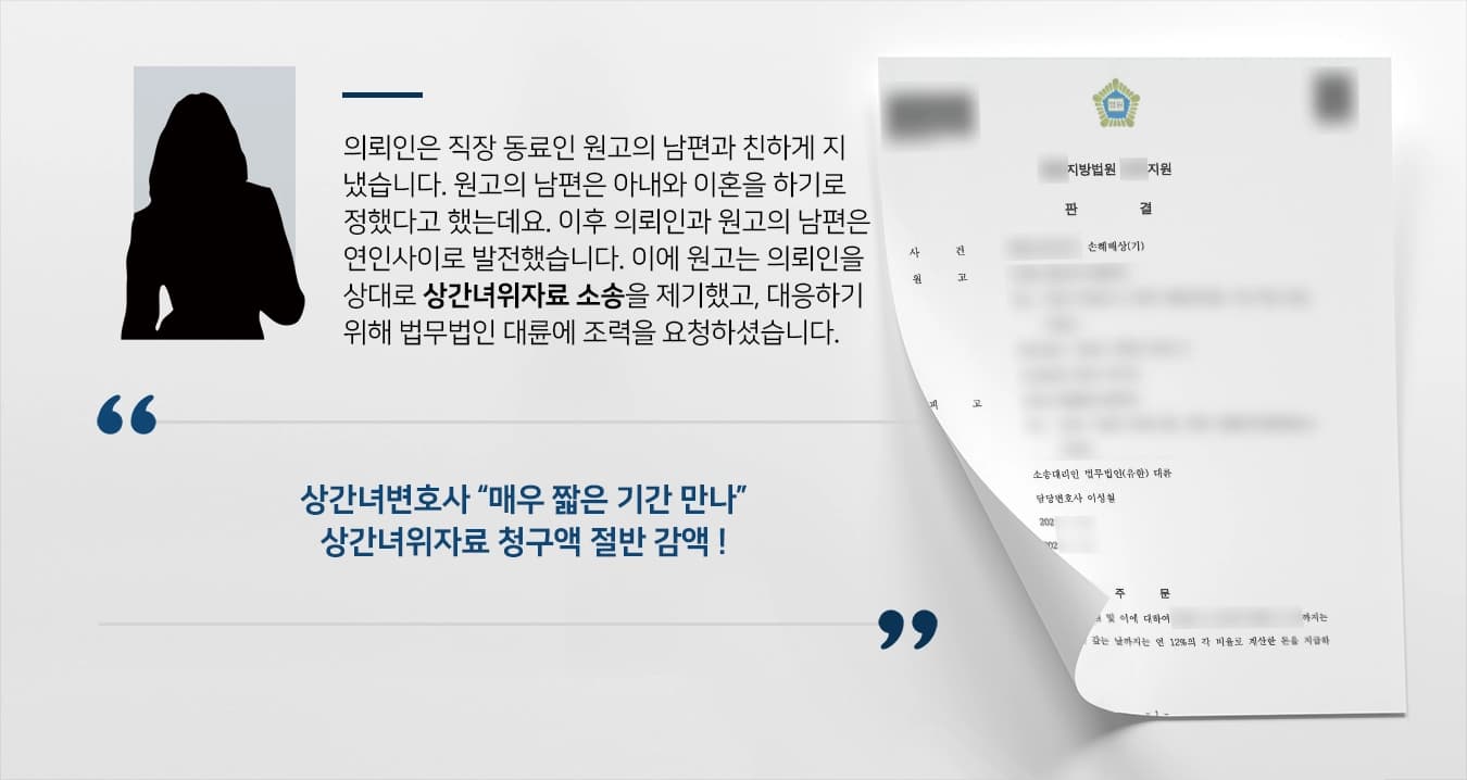 법원은 법무법인 대륜 상간녀변호사 팀의 주장을 받아들여 ‘상간녀위자료 청구액 절반 감액’ 판결을 내렸습니다.